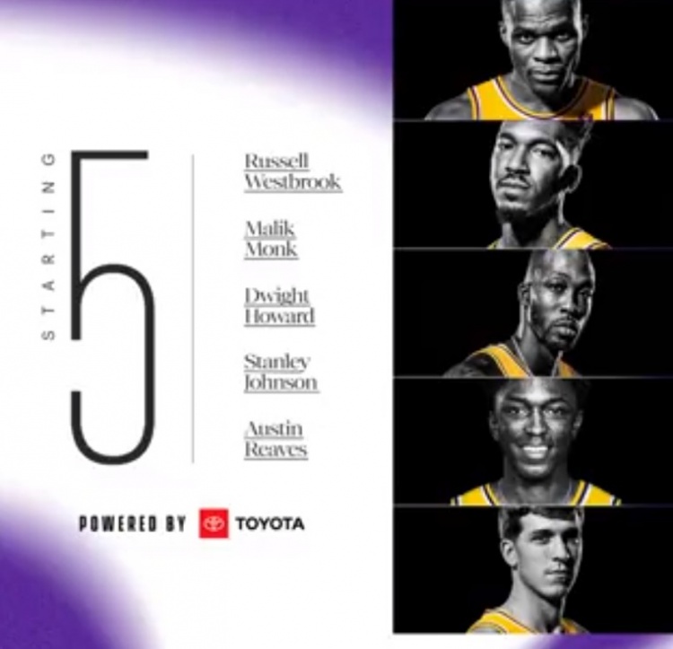 本场比赛詹姆斯缺战,湖人使用全新首发:威少、里夫斯、蒙克、霍华德、斯坦利-约翰逊