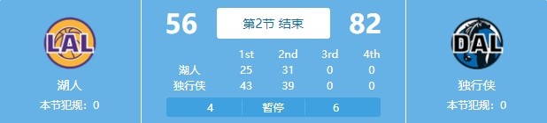 3月30日讯 今日常规赛,湖人客场挑战独行侠,半场湖人暂时以56-82落后。