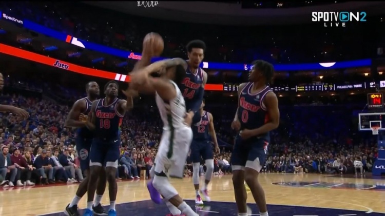直播吧3月30日讯雄鹿今日客战76人。第四节,字母哥内线接球后虚晃,空中的丹尼-格林直接手臂呼到了字母哥的脸上,裁判看过录像之后吹罚了格林一级恶意犯规!(汤普林)
