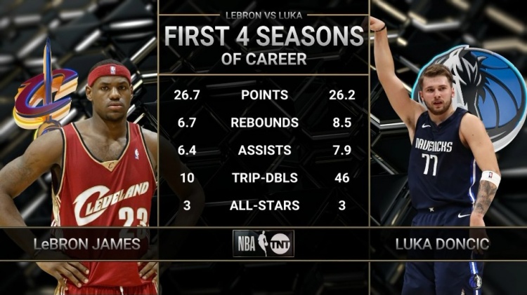 赛中,转播商晒出了詹姆斯与东契奇生涯前四季的数据对比。