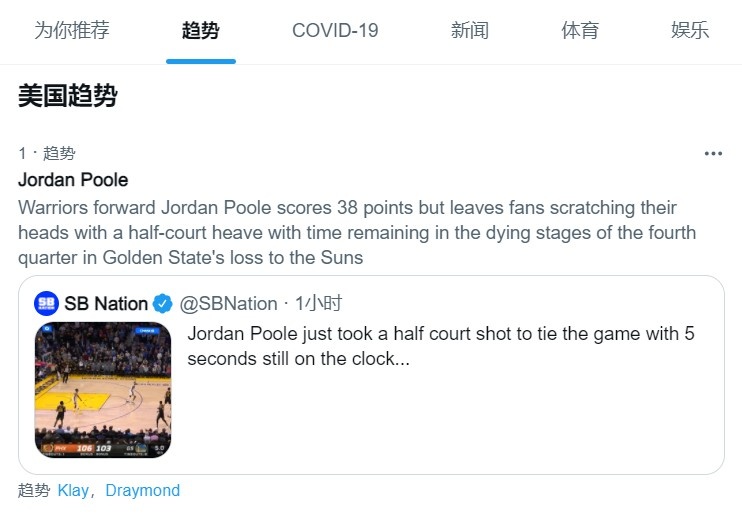 赛后,普尔冲上了全美热搜第一位,但也还附带着追梦和克莱……