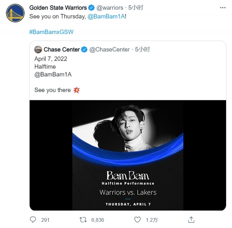 直播吧4月5日讯大通中心官推今日宣布,在韩国出道的泰国籍男艺人BamBam将在当地时间4月7日勇士vs湖人的中场进行表演。在此前的全明星投票期间,BamBam在自己的社媒上多次为勇士队员拉票,帮助维金
