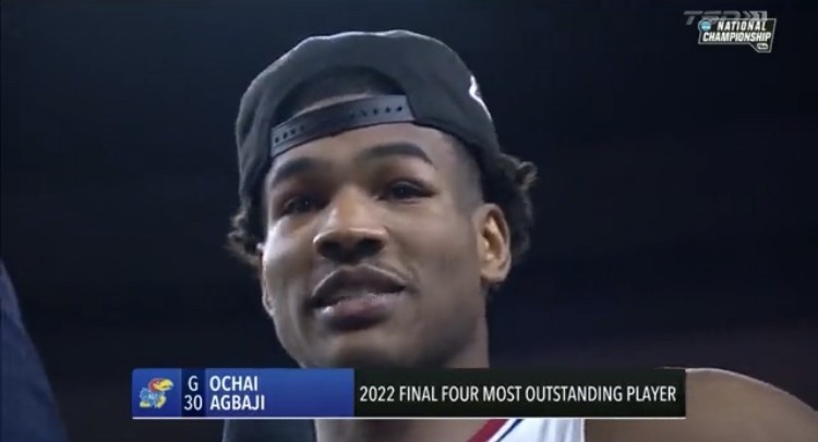 4月5日讯 NCAA疯狂三月决赛,堪萨斯逆转北卡夺冠。堪萨斯后卫阿巴吉当选MOP。本场他出战37分钟,投篮9中4,三分4中1,拿到12分3篮板1助攻1抢断1盖帽。