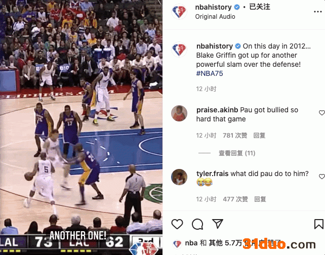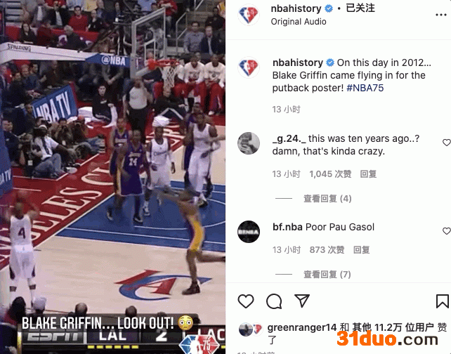 直播吧4月5日讯十年前的今天,即2012年4月5日,快船108-113不敌湖人。本场比赛,当时效力快船的格里芬上演名场面,他两度在大加索尔头上完成隔扣。而加索尔队友拜纳姆当时表情:本场,格里芬16中7