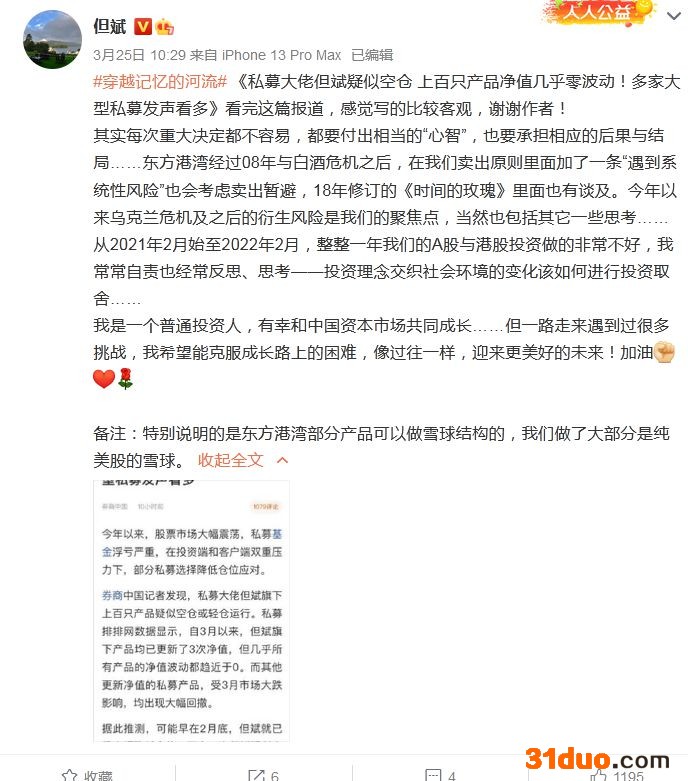 3月底,但斌空仓的消息让市场为之一震,也成为财经圈热议的话题。