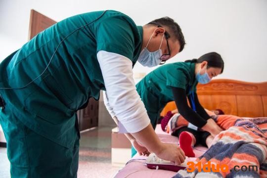 2021年11月12日,在湖南省长沙市长沙县果园镇杨泗庙社区,医务人员彭永(左)、刘敏给居家老人做理疗。新华社记者 陈思汗 摄