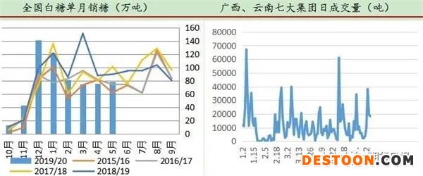 国内目前正值纯销售季,食糖销售进度和去库存情况对糖价有重要影响。2019/2020榨季全国共生产食糖 1040.72 万吨,同比少35.32万吨。5月销售数据显示,截至5月底,累计销售食糖631.09 万吨,同比减少35.68万吨。累计销糖率 60.64%,同比少1.3个百分点。工业库存409.63万吨,同比增0.36万吨。其中5月单月销糖78.32万吨,同比少11.51万吨,环比增2.5 万吨。5月全国销量基本持稳上个月,显示消费淡季销售稳定,工业库存水平同去年同期。