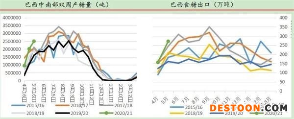 4—10月是巴西食糖生产旺季,而巴西糖是全球主要供应糖源。据巴西甘蔗行业协会报告,其中南部5月上半月产糖250万吨,同比增55%;甘蔗压榨量4246万吨,同比增8.76%;甘蔗制糖比47.2%,高于去年同期的36%。截至5月上半月,2020/2021榨季累计压榨甘蔗1.0301亿吨,同比增21.67%;累计产糖549万吨,同比增83.88%;甘蔗制糖比45.31%,去年同期为32.19%;累计产乙醇43.99亿公升,同比增8.57%。由此可见,巴西产糖量同比明显提高。