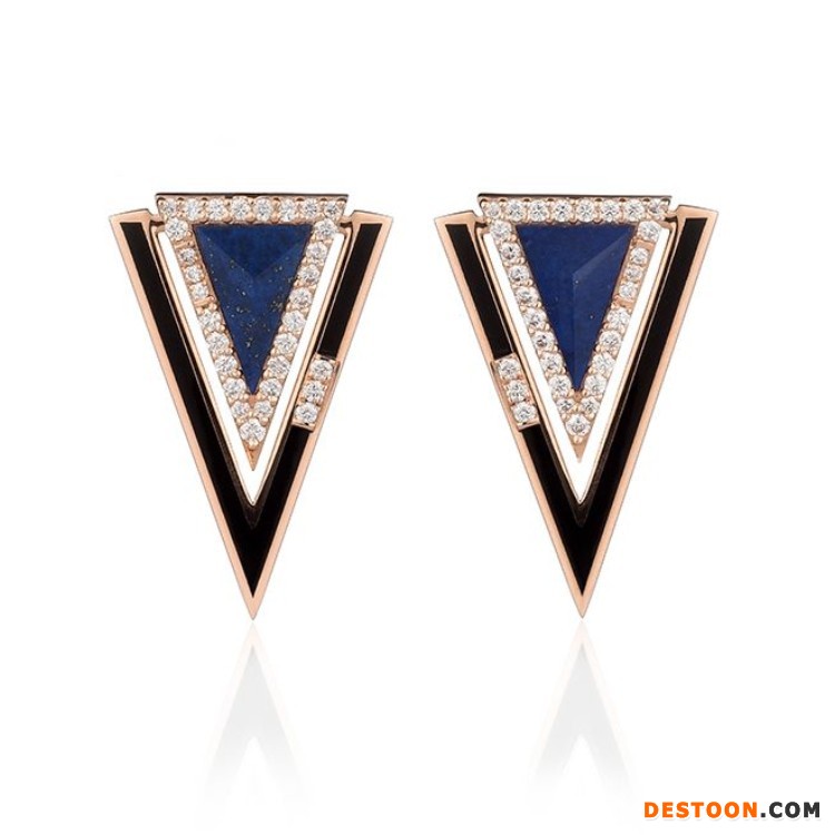 天然半宝石材质定制切割成三角形、菱形等几何形状,演绎绚丽的色块——深绿色孔雀石呈现清晰的带状纹路;深蓝色青金石拥有黄铁矿斑纹;黑色缟玛瑙纯粹而简练;珊瑚则拥有明快的橘红色调。闪耀的钻石镶边成为点睛,让几何图形更为鲜明。