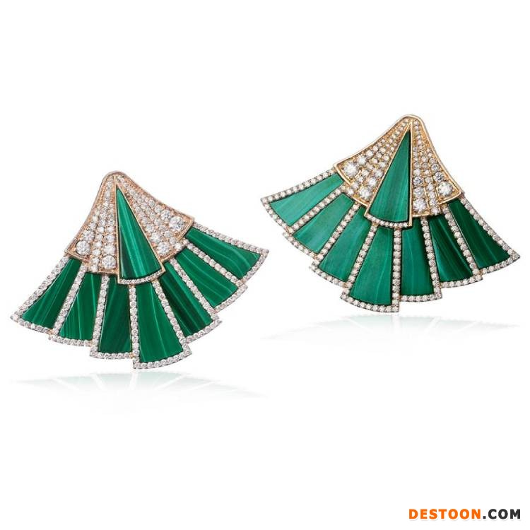 新作可选戒指、耳坠和挂坠单品——最引人注意的是一枚金质戒指,设计师将戒面塑造成菱形锥体结构,4面和棱边分别镶嵌孔雀石切片和璀璨圆钻,赋予建筑般的立体造型;亮点是一颗水滴形祖母绿装饰其上,形成出色的视觉层次。