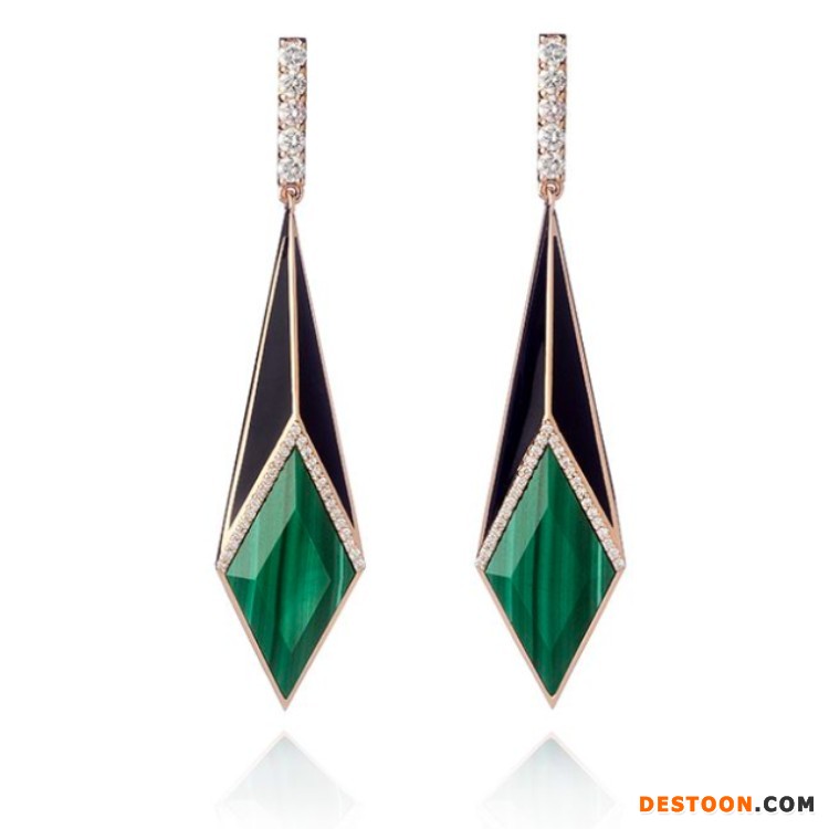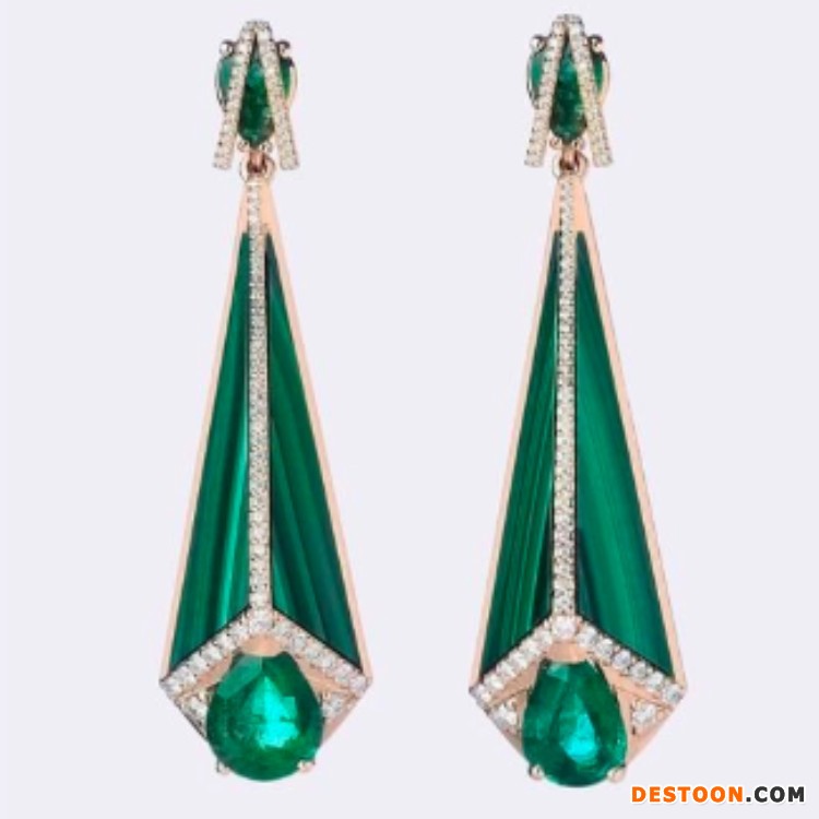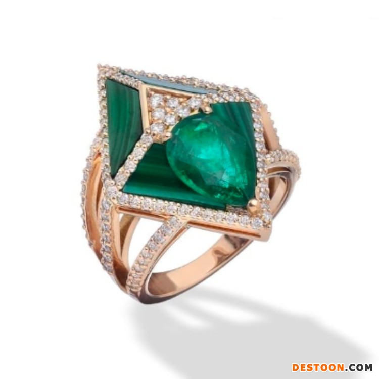 主石为水滴形切割祖母绿,镶嵌定制切割孔雀石,点缀圆形明亮式切割钻石。