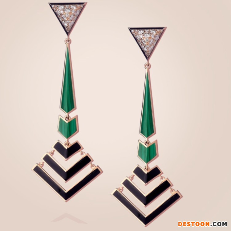 「装饰艺术」(Art Deco)运动起始于1910年代,1925年起开始影响珠宝领域,设计主要运用交错的线条、简练的几何图形、色块拼接等。新作运用金质勾勒出珠宝的几何形轮廓,你可以看到图形经过叠加、延伸和对称,展现独特的韵律感。