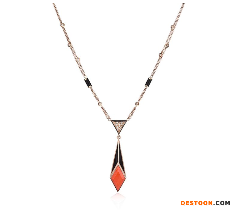 镶嵌定制切割红珊瑚和缟玛瑙,点缀圆形明亮式切割钻石。