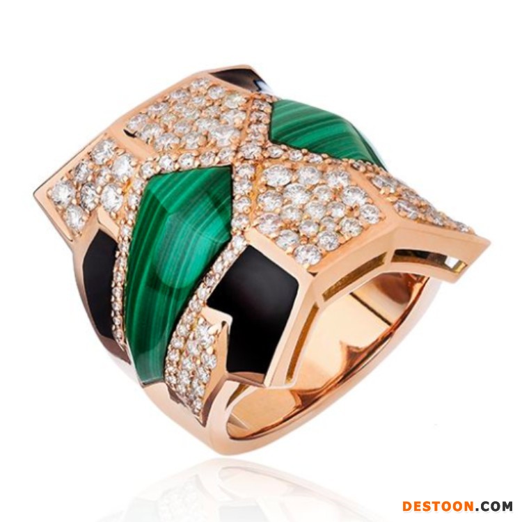 镶嵌定制切割孔雀石,点缀圆形明亮式切割钻石。