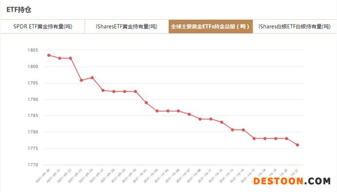根据黄金信息网站www..com对全球8大主要黄金ETF的监控数据显示,截至2021年10月21日,全球8大黄金ETFs持仓总量为1776.007吨,与上一交易日减少2.03吨。