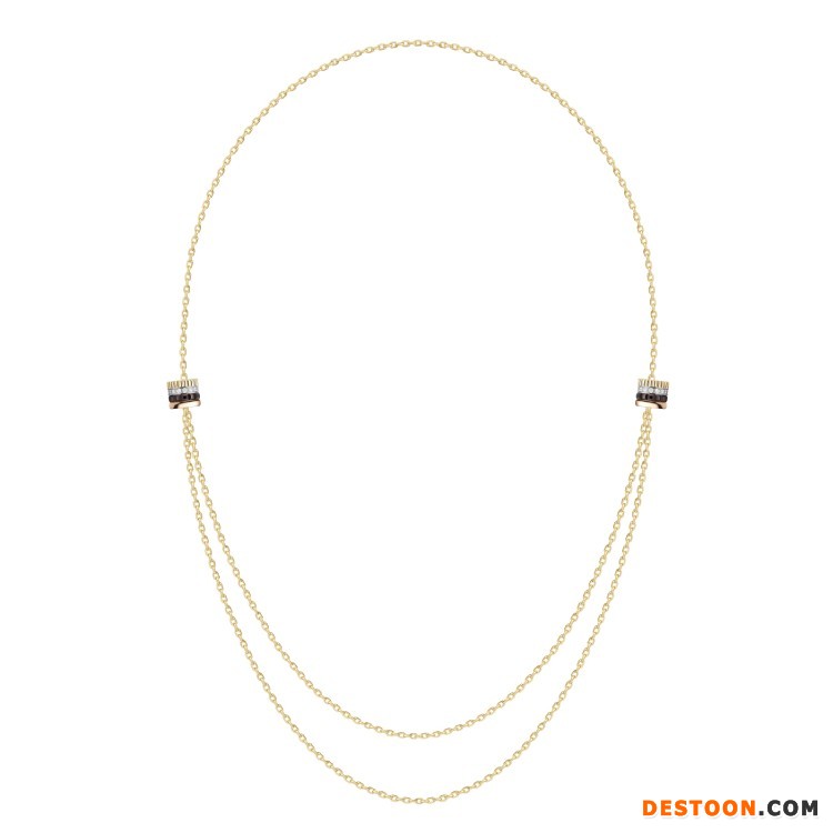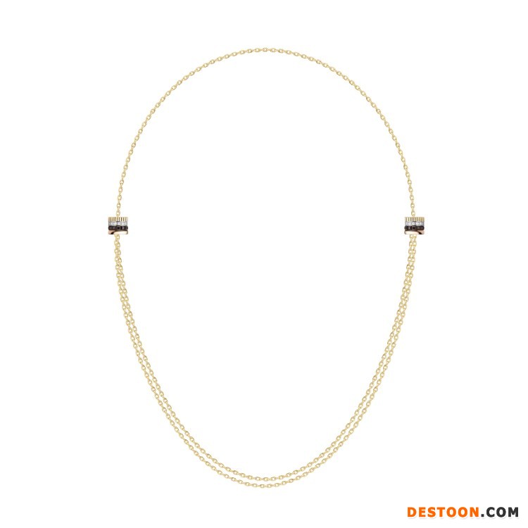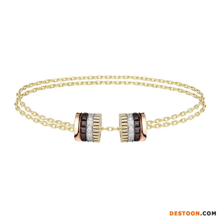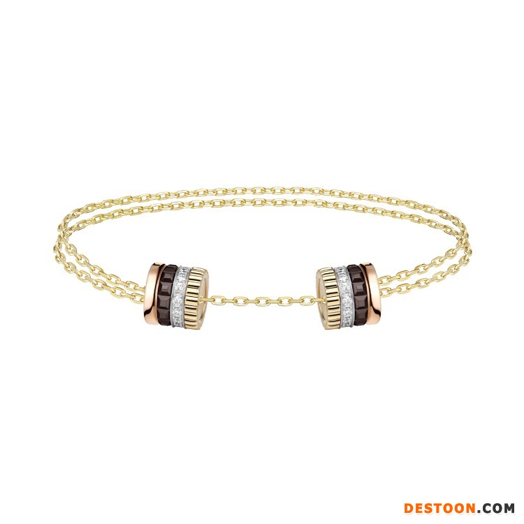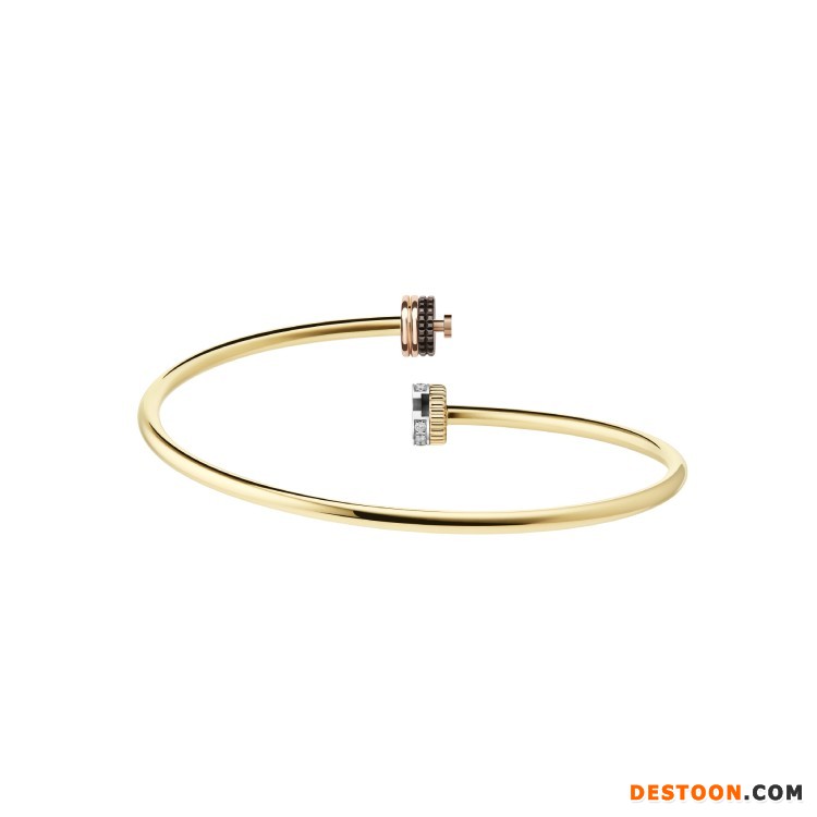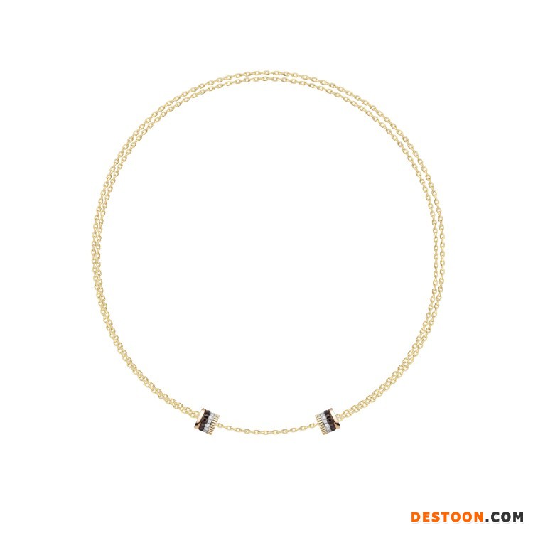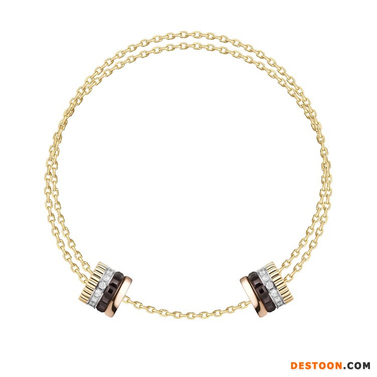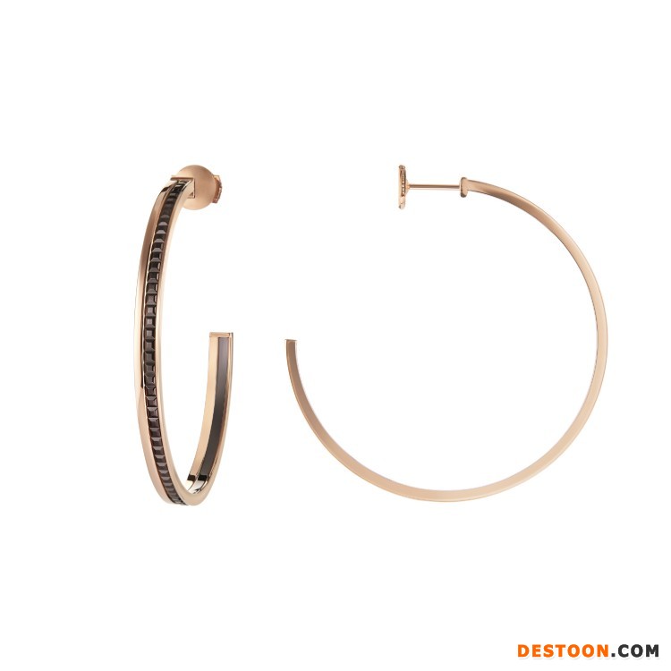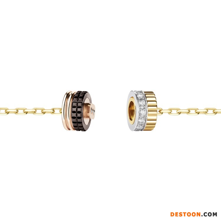 该系列共由5件单品组成——手链和长项链饰有2个扣环,可沿着黄金链条自由滑动并固定于任意位置,展现佩戴者的独特个性;手镯和项链引入隐秘式搭扣结构,可将扣环巧妙打开;耳环则由2个装饰元素组成,棕色 PVD 镀层搭配玫瑰金显得简洁而摩登。