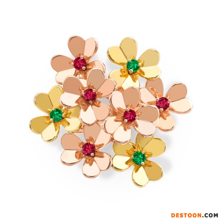 采用玫瑰金和黄金制作,镶嵌圆形切割红宝石和祖母绿。