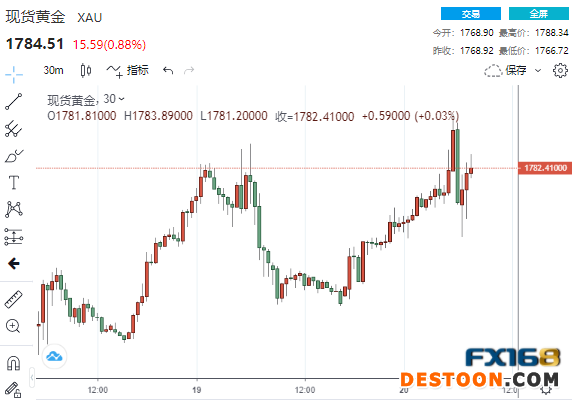 美市盘中,现货黄金延续涨势,交投于1780美元上方,稍早一度上涨1.2%,触及1788.34美元高点,但随着美债收益率上涨,金价回吐了部分涨幅。