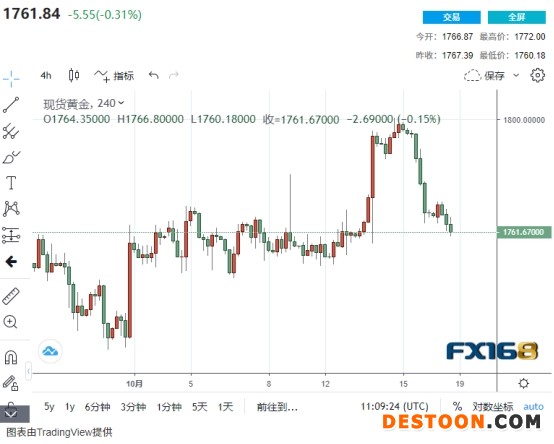 周一(10月18日)欧市盘中,金价持续承压,跌至1760关口,延续上周五以来的跌势,日内最低触及1760.18美元/盎司,因美元、美债收益率上扬。