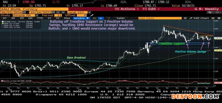 但出于几个原因,该1680美元的低点意义重大。首先,该下跌恰好保持在重要支撑位。其次,黄金靠着形成“积极的成交量波动”(低点高于前一周,且收盘高于前一周收盘价),从支撑位反弹3倍。第三,价格下跌动能正在减弱,即使黄金触及更低的低点。