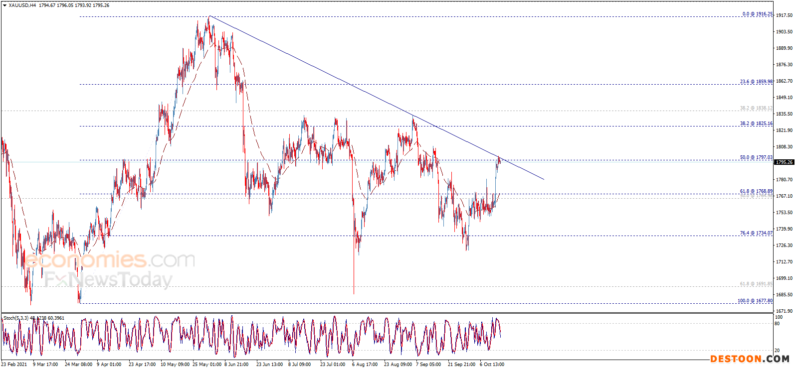 Economies.com预计,今日金价交投将位于支撑位1785.00美元/盎司以及阻力位1810.00美元/盎司之间。