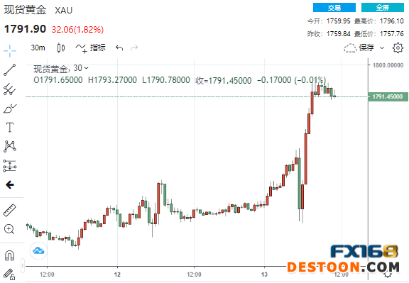 美市盘中,现货金上涨0.2%,交投于1797美元一线,稍早一度突破1800美元关口,触及9月15日以来的最高点1800.49美元。
