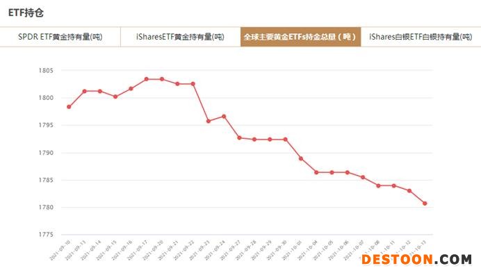 根据黄金信息网站www..com对全球8大主要黄金ETF的监控数据显示,截至2021年10月13日,全球8大黄金ETFs持仓总量为1780.657吨,与上一交易日减少2.33吨。