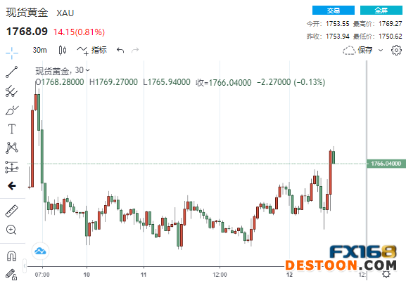 美市早盘,现货黄金短线急涨并刷新日高至1769.27美元/盎司,较日低拉升近20美元。