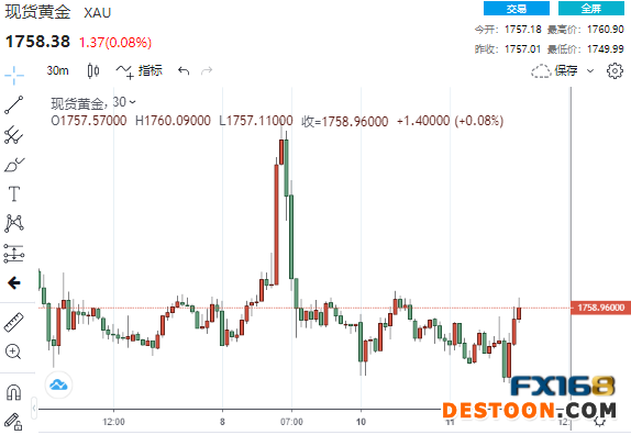 美市早盘,现货金交投于1758美元一线,日内在11美元狭窄区间内波动。