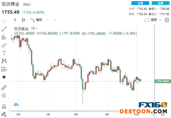 美市尾盘,现货黄金收报1755.49美元/盎司,下跌7.05美元或0.40%,盘中最低触及1751.83美元/盎司,较日高1766.86美元/盎司回落15美元。