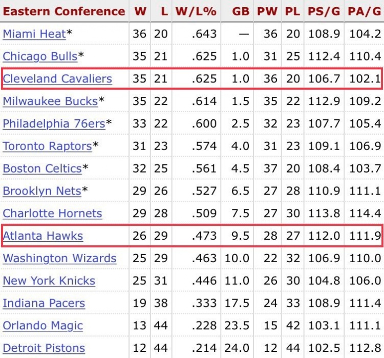 值得一提的是,骑士本赛季在全明星周末时以35胜21负排在东部第三,老鹰26胜29负排在东部第十。而常规赛结束时骑士44胜38负排名东部第八,老鹰43胜39负排名东部第九。