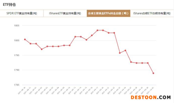 根据黄金信息网站www..com对全球8大主要黄金ETF的监控数据显示,截至2021年10月1日,全球8大黄金ETFs持仓总量为1788.877吨,与上一交易日减少3.49吨。