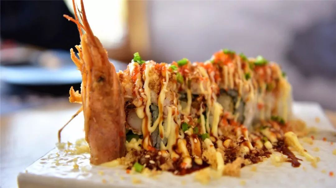 一整只虎虾经过热油的洗礼,变的黄灿灿的鲜香酥脆,和青瓜一起包裹进,甜润有嚼劲的米饭里,在点缀上鱼籽和葱花,看着觉得口水快要失控了。