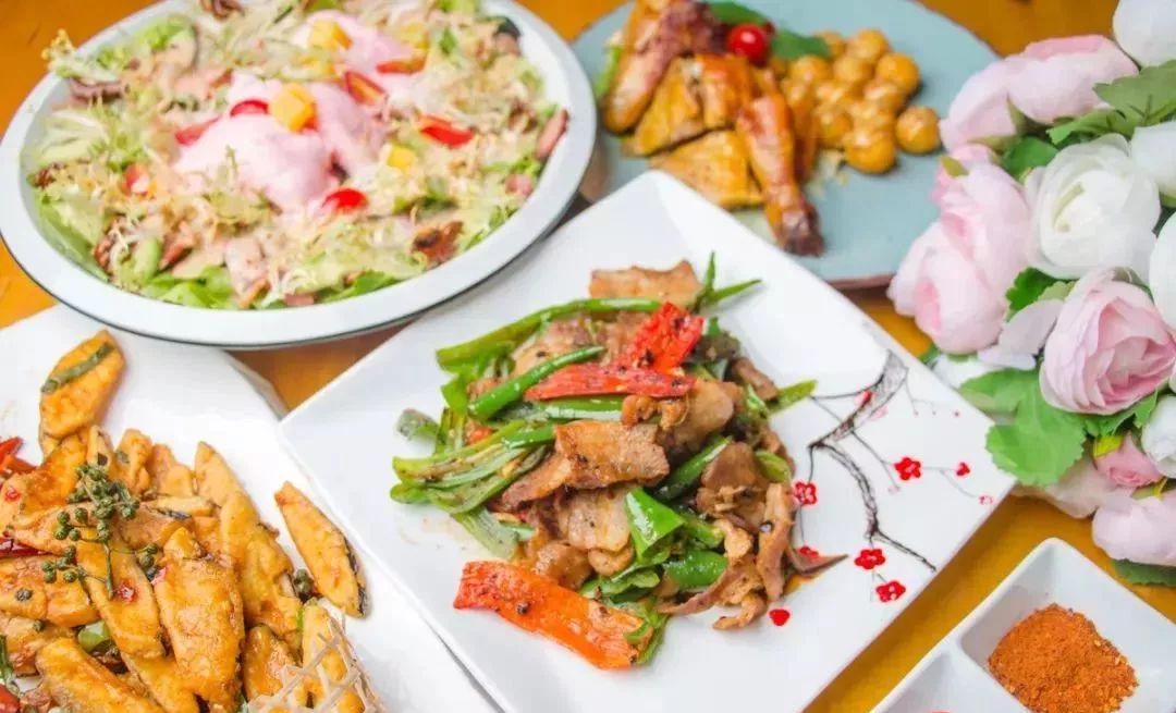 油淋椒麻鸡:一层洋葱,一层青笋,去骨鸡腿肉埋在上面,撒上大把四川麻椒,利用滚烫的油把食材的香气瞬间激发。让鸡肉表皮微焦,从而锁住了水分,吃起来是一种又香又麻的感觉。