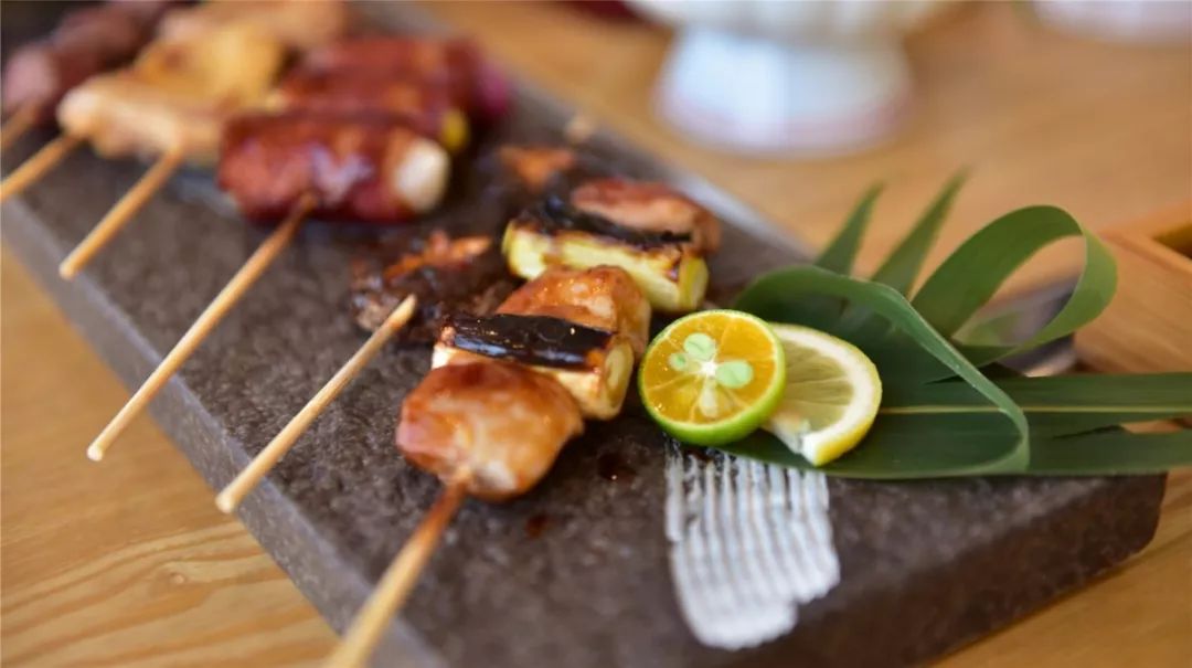 所谓的烧鸟,当然不是吃鸟啦,“烧鸟”是把鸡肉切成一口大小后串起来,然后用火烤制并调味的一种食物,在师傅的高温炙烤后便可食用。
