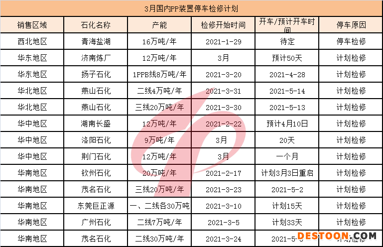 表中可见,3月份PP装置可望迎来检修小高峰,特别是华南、华中地区尤为集中,且周期普遍偏长,基本在20-38天之间,预计资源损失量约达12.97万吨,加之突发性造成的资源流失,现货资源供应或将得到一定缓慢。