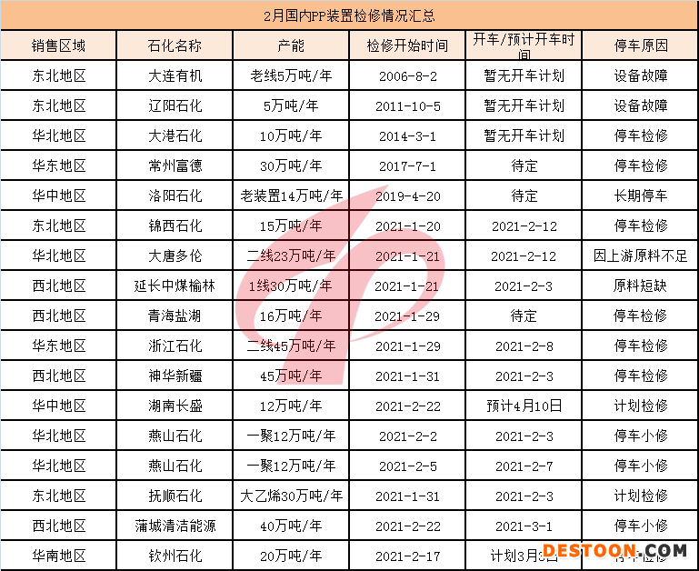 相较于上月,2月国内PP装置检修进程放缓,及16家生产厂家、16条生产线停车检修,涉及产能仅352万吨/年。