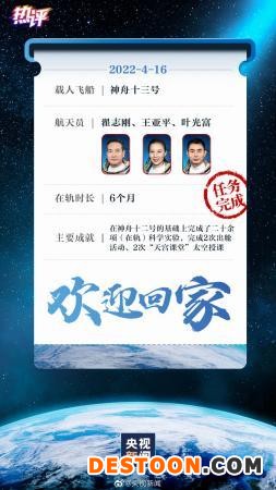 “感觉良好!”“感觉非常良好!”北京时间2022年4月16日9时56分,神舟十三号载人飞船返回舱在东风着陆场预定区域成功着陆,航天员翟志刚、王亚平、叶光富结束了半年多的“太空出差”顺利返回,神舟十三号载人飞行任务取得圆满成功!