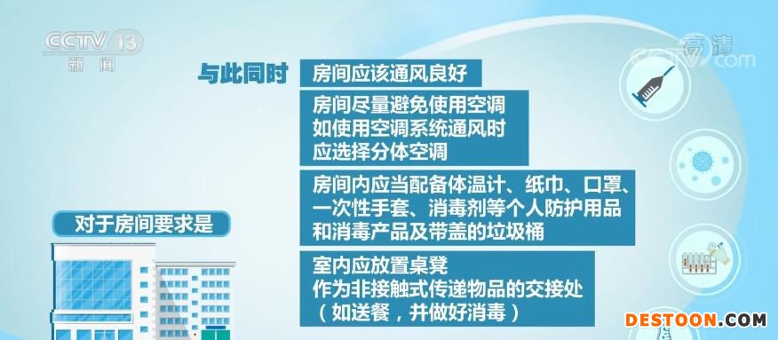 对于房间要求是,家中如果有多套房屋,最好单独居住;如果只有一套房屋,选择一套房屋里通风较好的房间作为隔离室,保持相对独立。尽量使用单独卫生间,避免与其他家庭成员共用卫生间。如果条件不允许,最好不要选择居家隔离。与此同时,房间应该通风良好;房间尽量避免使用空调,如使用空调系统通风时,应选择分体空调。房间内应当配备体温计、纸巾、口罩、一次性手套、消毒剂等个人防护用品和消毒产品及带盖的垃圾桶。室内应放置桌凳,作为非接触式传递物品的交接处(如送餐,并做好消毒)。