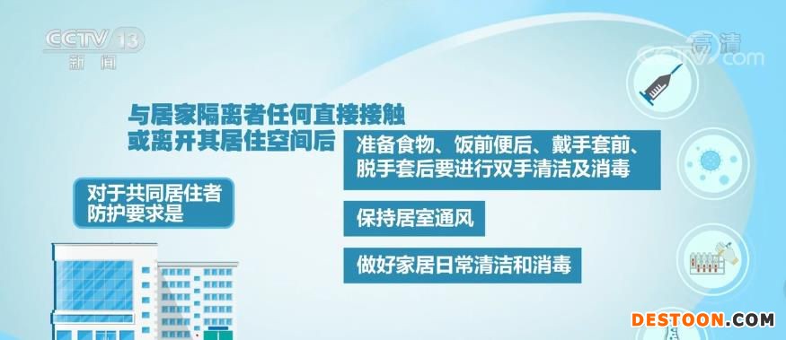 对于共同居住者防护要求是,共同居住者或者陪护人员一并遵守居家隔离管理要求。共同居住者与隔离者共处一室时,应规范佩戴口罩,并及时更换;与居家隔离者任何直接接触,或离开其居住空间后,准备食物、饭前便后、戴手套前、脱手套后要进行双手清洁及消毒。保持居室通风;做好家居日常清洁和消毒。