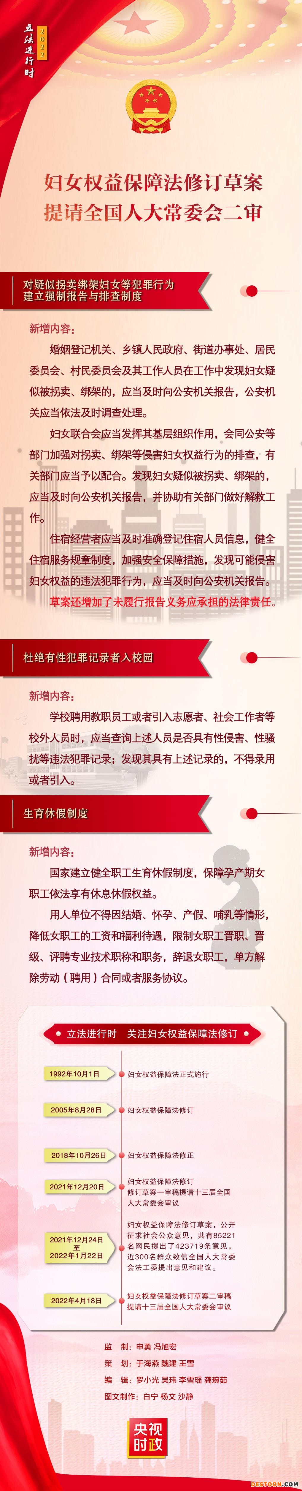《中华人民共和国妇女权益保障法(修订草案)》18日提请十三届全国人大常委会第三十四次会议二审。 修订草案新增内容包括:对疑似