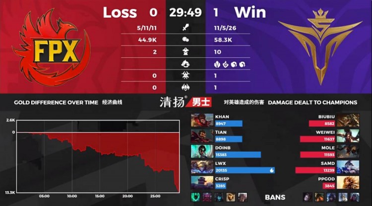 【27:00】双方野区遭遇,FPX击杀V5三人后,一波推进结束比赛。