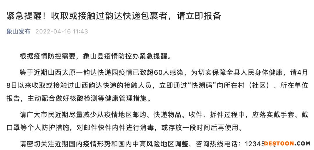 山西省疾病预防控制中心提醒大家:近14天内收取或接触过韵达快递包裹的人员,要主动向居住地社区(村)、单位或酒店报备,积极配合属地落实疫情防控有关措施。对不按规定落实疫情防控措施、不如实报告个人情况、引起传染病传播的,公安机关将依法严肃追究法律责任。