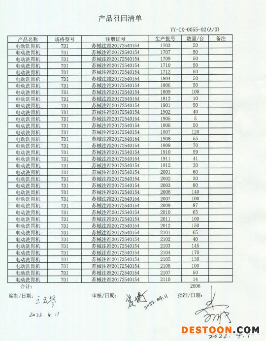 本次召回原因系国家局抽检发现7DI电动洗胃机,批号2102,产品编号:2102020005,使用口腔插管流量应不小于2.0L/min,实测值1.6-2.3。不符合产品技术要求。上海院和中检院检测洗胃机“冲流量”时用“听声计时”,公司用“目视计时”,因检测方法不同,导致检测结果不符合产品技术要求。