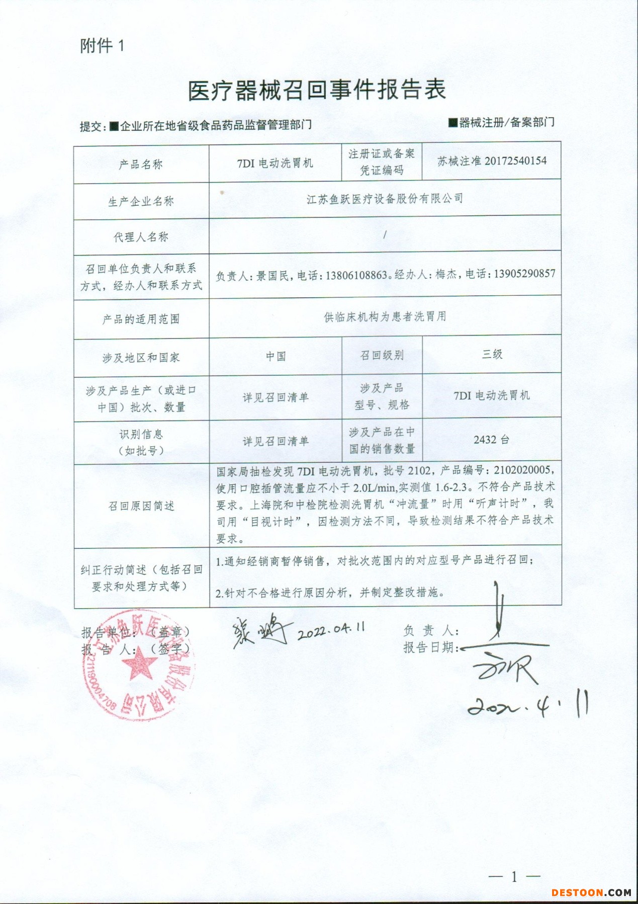 本次召回的产品为7DI电动洗胃机。该产品适用于供临床机构为患者洗胃用。该产品注册证或备案凭证编码为苏械注准20172540154,生产企业为江苏鱼跃医疗设备股份有限公司。本次召回涉及地区和国家为中国;召回级别为三级;涉及产品型号、规格为7DI电动洗胃机;涉及产品在中国的销售数量为2432台。