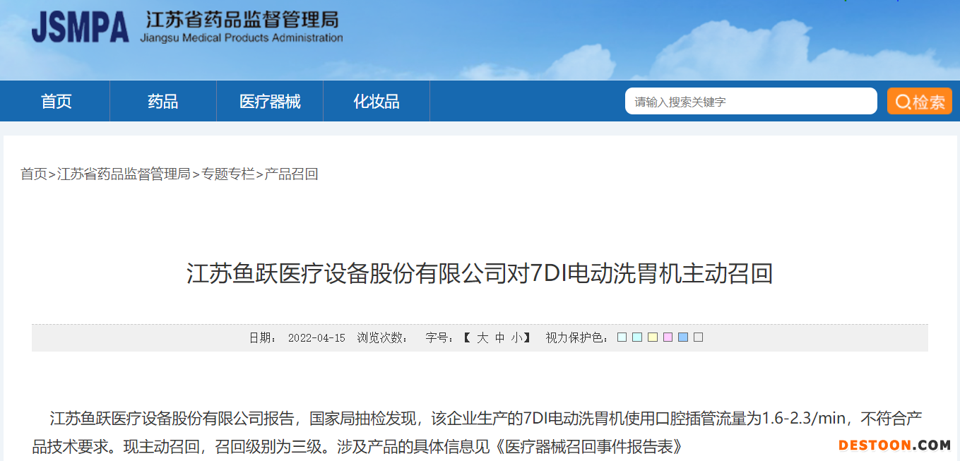 中国经济网北京4月20日讯 近日,江苏省药品监督管理局网站发布了江苏鱼跃医疗设备股份有限公司对7DI电动洗胃机主动召回的公告。日前,江苏鱼跃医疗设备股份有限公司(“鱼跃医疗”,002223.SZ)报告,国家局抽检发现,该企业生产的7DI电动洗胃机使用口腔插管流量为1.6-2.3/min,不符合产品技术要求。现主动召回,召回级别为三级。