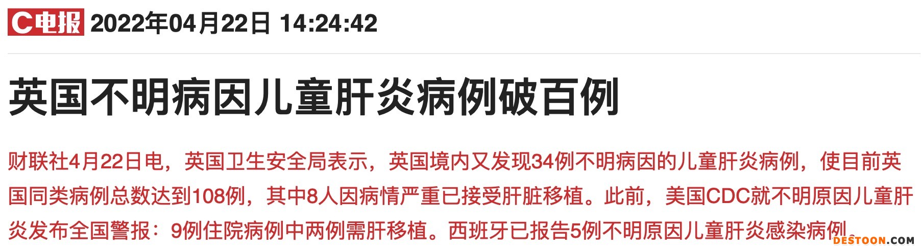消息面上,今日下午14时24分,英国卫生安全局表示,英国境内又发现34例不明病因的儿童肝炎病例,目前当地不明病因儿童肝炎病例破百例。此外,今日上午,美国CDC就不明原因儿童肝炎发布全国警报:9例住院病例中两例需肝移植。