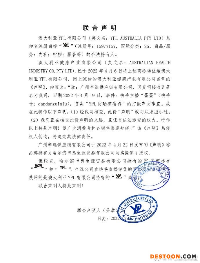 不过,辛选的这一说法被品牌方否认。今日下午,微博认证为“杭州雪梨品牌管理有限公司”、账号名称为“YPL运动潮品”的微博发布声明称,从未与澳生源有任何业务合作,不存在任何商标授权行为。辛选所示的加盖有“澳大利亚健康产业有限公司”公章的授权书属于伪造公章,其将追究伪造者相应的法律责任。
