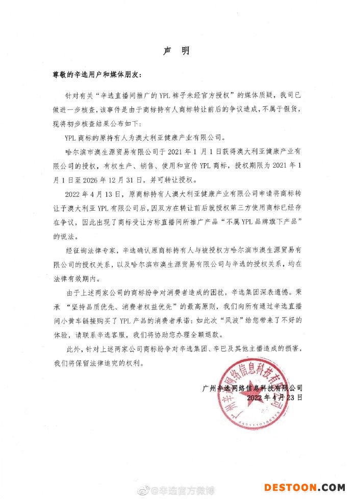 辛选方面指出,YPL商标的原持有人为澳大利亚健康产业有限公司(健康产业公司),哈尔滨市澳生源贸易有限公司(下称“澳生源”)于2021年1月1日获得健康产业公司的授权,有权生产、销售、使用和宣传YPL商标,授权期限为2021年1月1日至2026年12月31日,并可转让授权。