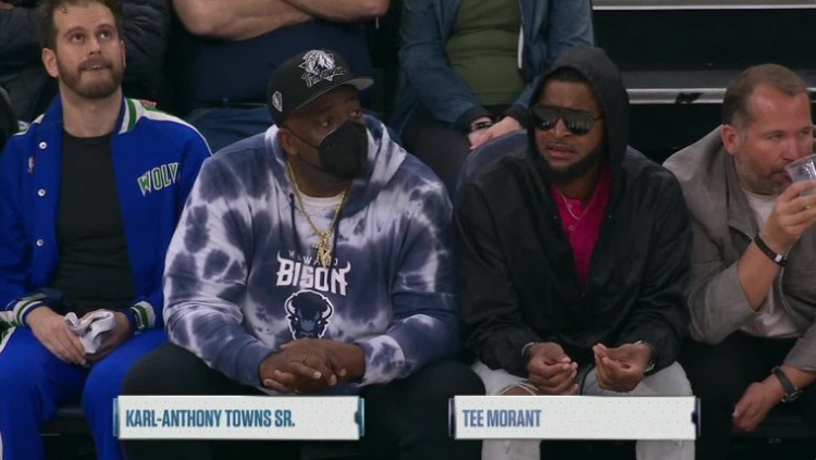 比赛中,森林狼球星唐斯的父亲与灰熊球星莫兰特的父亲坐在一起观看比赛。